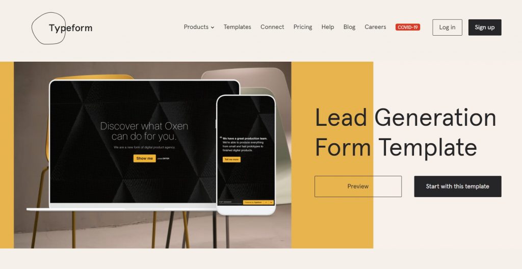 Typeform template is a functional form builder tool that doesn’t require any coding skills from you. There are tons of pre-made templates for you to choose from.