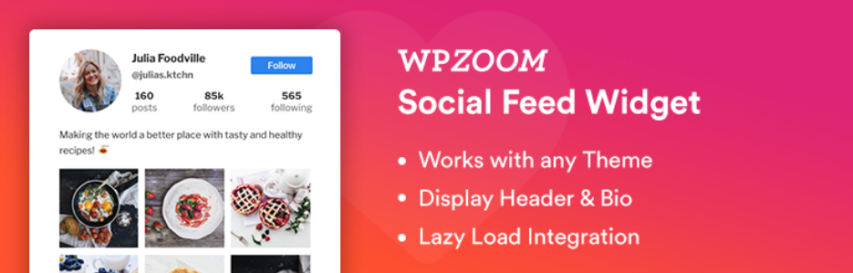 Formerly known as Instagram Widget by WPZOOM, WPZOOM Social Feed Widget is a fully customizable widget to display Instagram feeds on your WordPress website. Using this Instagram wall for WordPress websites, you can even display Instagram accounts including the number of followers, followings, posts, bio, and usernames. So, this can be a great choice for you especially if you want to introduce Instagram accounts in your blog posts.